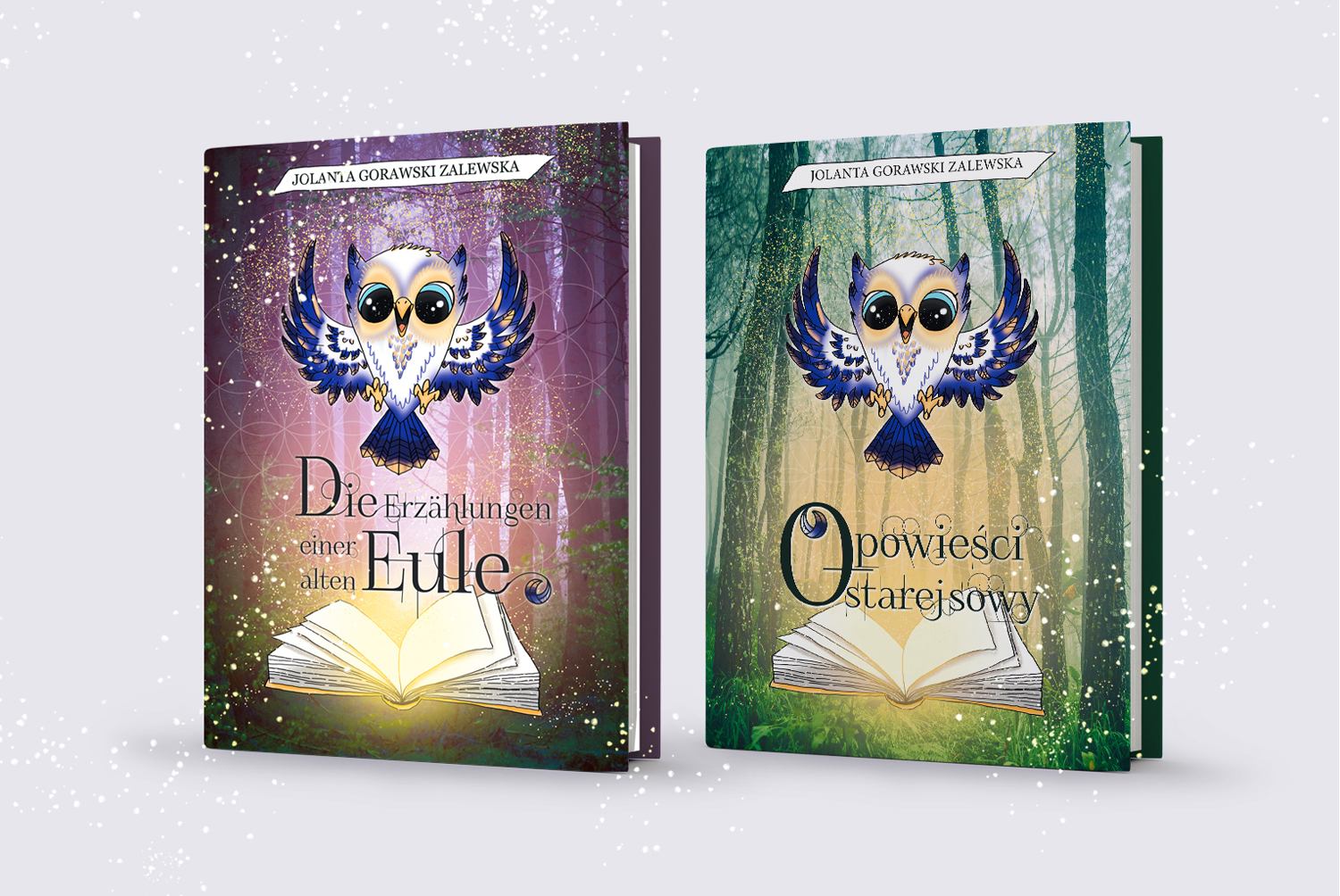 Die Illustration wurde händisch entwickelt. Die Feder als Detail in der Überschrift in den beiden Sprachen. Die Feder soll von der gezeichneten Eule sein, die als Erzählerin für die Märchen in den Buch aggiert.
