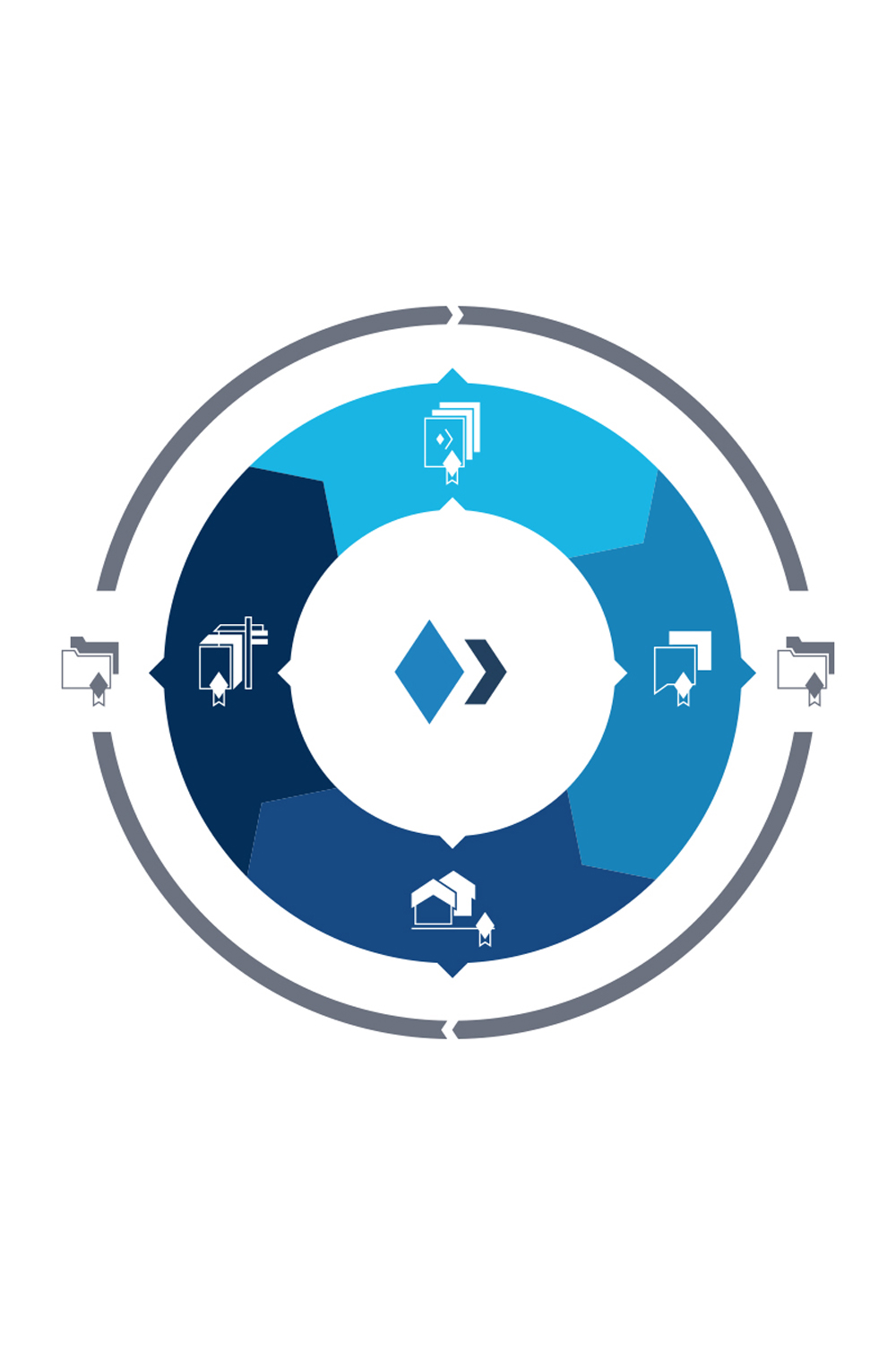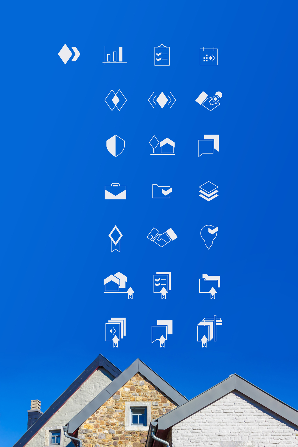 Das Bildlogo der Firma wurde als Basis genommen. Das Bildlogo beinhaltet die Raute und den Pfeil. Jedes Icon enthält einen Teil der beiden Elemente. Das schafft einen einzigarten der direkt mit dem Logo verbunden ist.