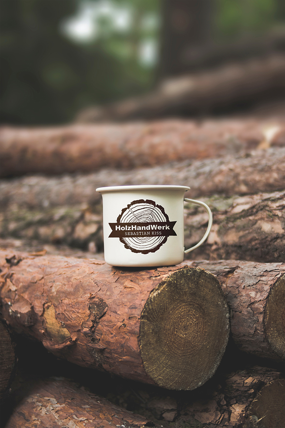 Produktentwicklung als Idee für Kunden. Emailletasse mit dem Logo.