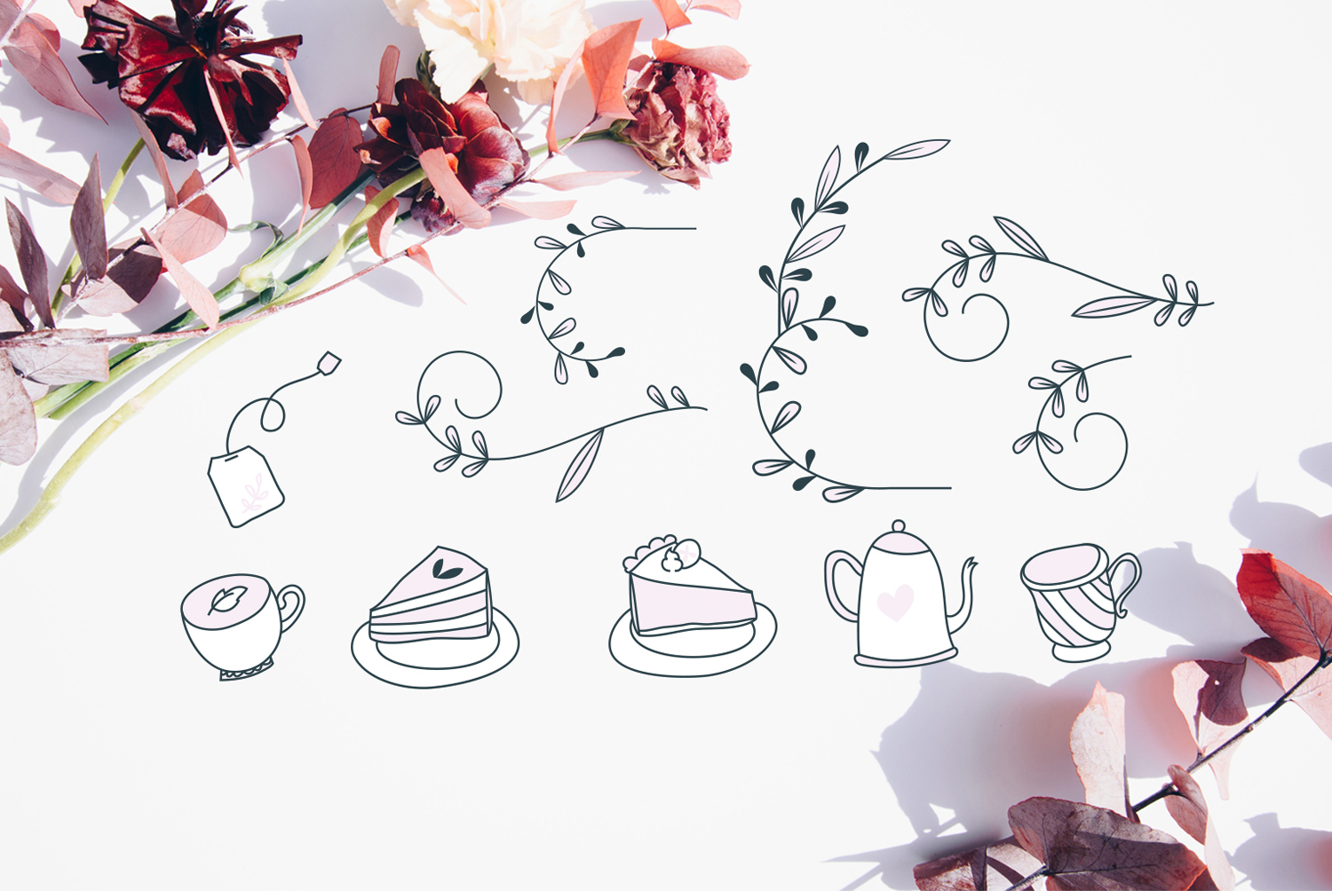 Kuchenstücke und Geschirr ist Handgezeichnet und als Grafik gebaut. Die Verschnörkelungen sind insperiert an die Schmiedeisernen Objekte am und im Cafe.