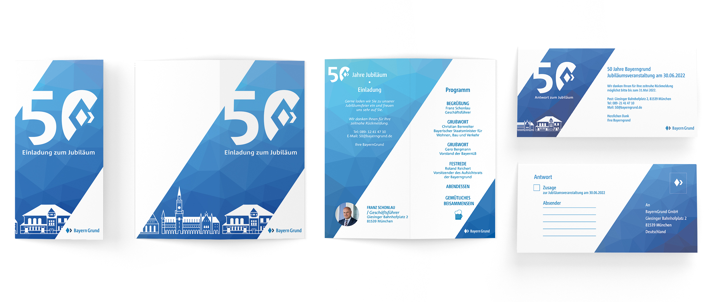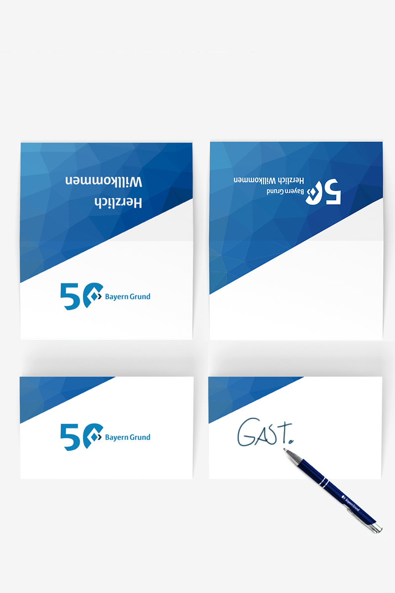 Die Zahl 50 wurde in der Raute platziert und der Überschuss abgeschnitten. So entsteht eine dynamisches Logo. Das Logo wurde von der Raute abgeleitet und das Konzept aus dem Pfeil entwickelt. So war das ursprüngliche Bildlogo die Insperiation für die 50 Jahr Jubiläum.